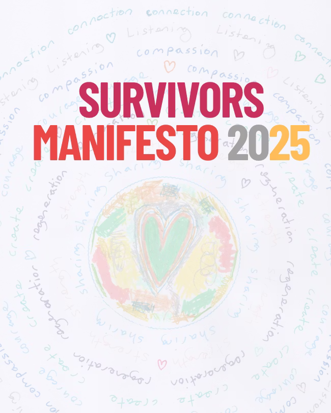 A rehearsed reading of the Survivors Manifesto, performed by participants and guest actors followed by a Q&A with guest speakers, focusing on survivor perspectives, the manifesto, and how creativity can support healing and change. The event aims to give voice to male, trans, and non-binary and all survivors, raise awareness, and encourage open, honest conversation.