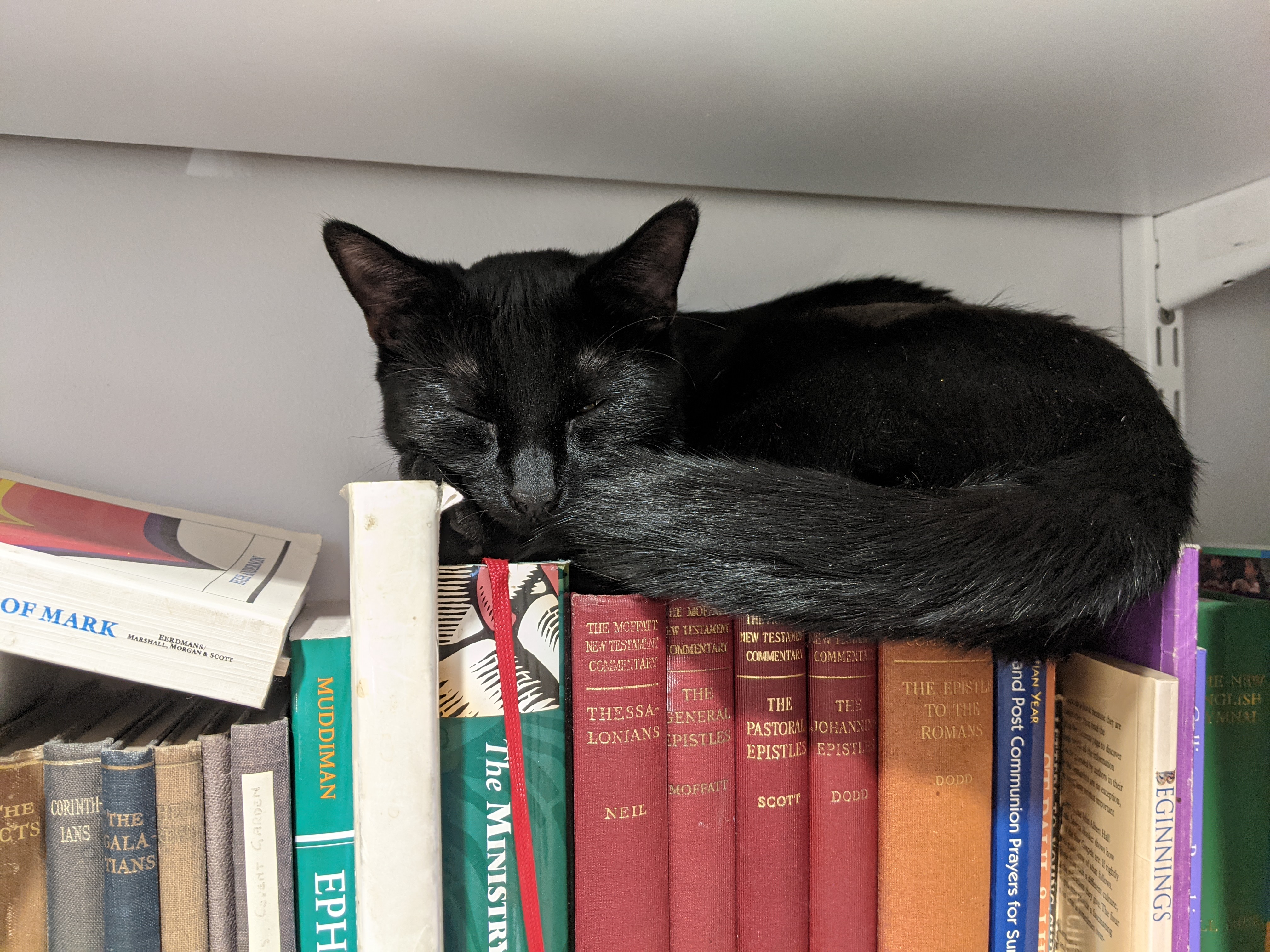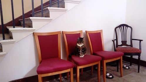Eliza loves visitors and will happily say hello. She loves a good stroke. She can often be found sleeping in a sunny patch above the doorframes in the narthex.