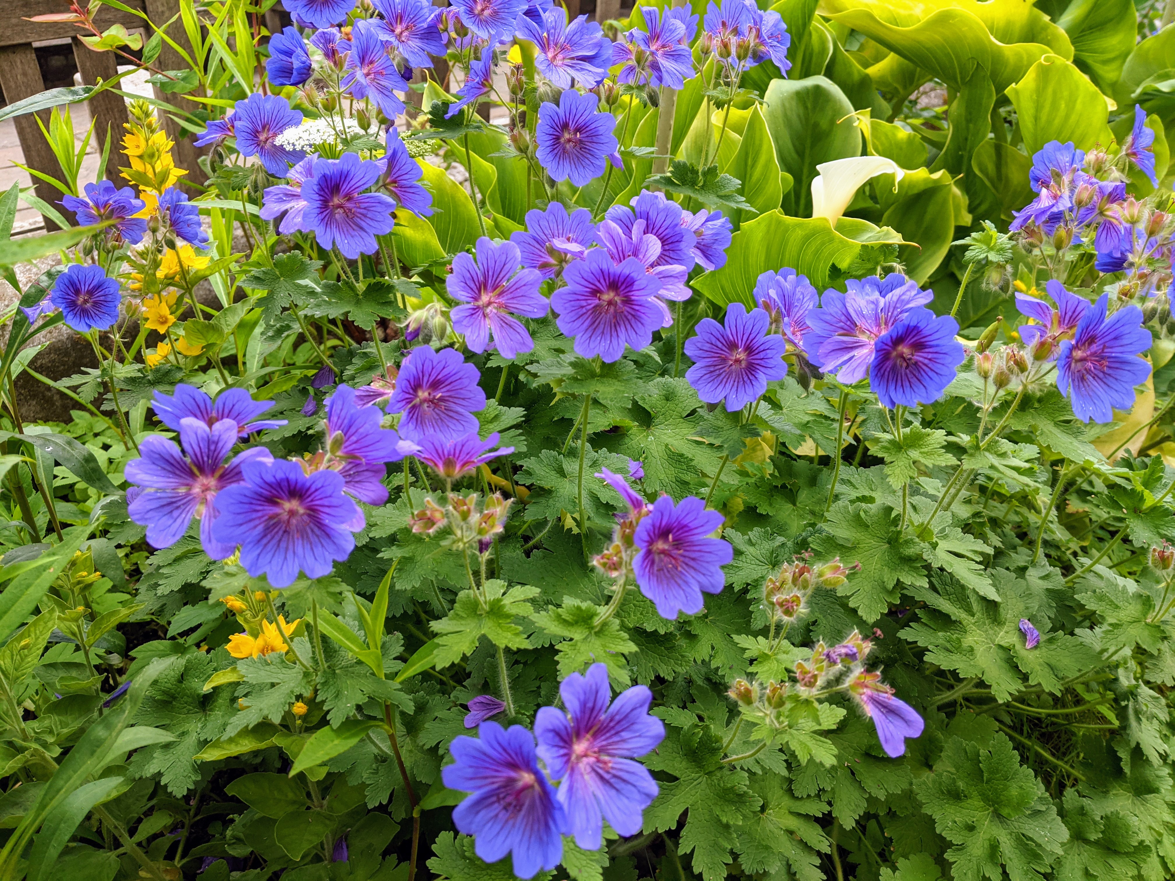 In other parts of the garden, whilst the soloist is the star, the harmony of a garden is built by the quieter notes of the hardy geraniums. Also known as ‘Cranesbill’ because its seed heads resemble the bill of a crane, hardy geraniums are beloved by bees and other pollinators and are related to pelargoniums, the bedding plant commonly referred to as geraniums. These blue pillows of cranesbill can be found throughout the garden and will go on flowering from now until the autumn.
