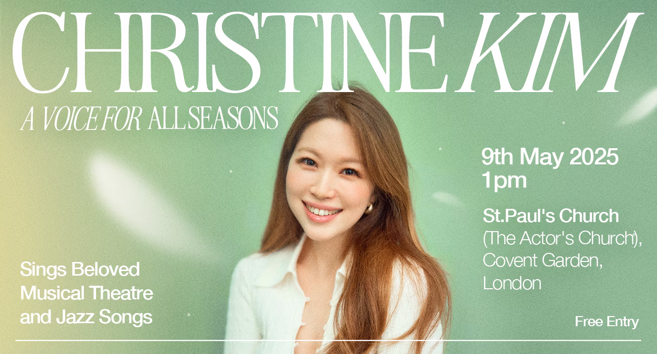 Christine Kim is a musical theatre actress, celebrated for her warm, expressive voice that brings stories to life. She trained at the Royal Academy of Music with a Master's degree. She has performed leading role at Sadler's Wells Theatre (Fan Letter) and national opera houses across Europe (Spring, Spring Again) and has held her solo concert at St. James's Church, Piccadilly. She also worked as a news anchor in South Korea. Her voice transcends genres, bringing each to life with authenticity and heart.